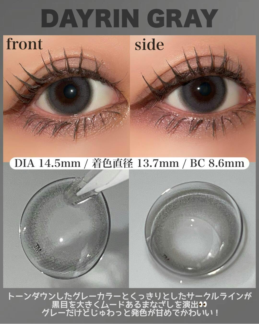 トーンダウンしたグレーカラーと、くっきりとしたサークルラインが黒目を大きくムードあるまなざしを演出✨